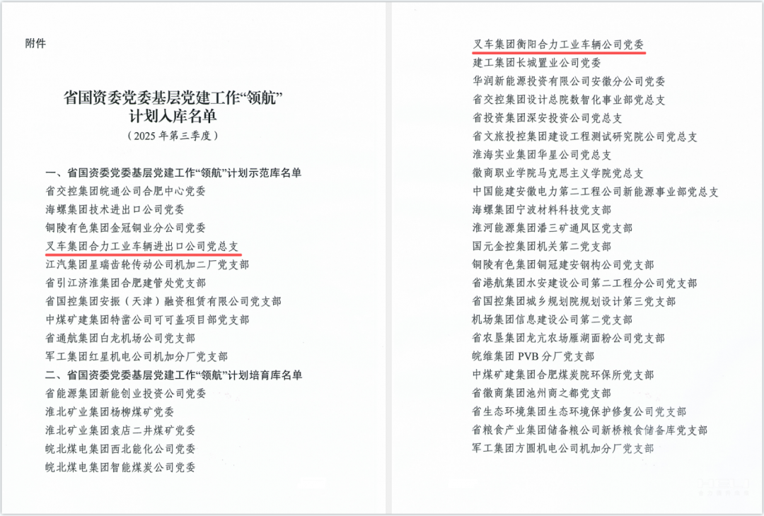 安徽叉車集團(tuán)黨委兩個(gè)黨組織分別入選省國(guó)資委黨委基層黨建工作“領(lǐng)航”計(jì)劃示范庫(kù)、培育庫(kù)